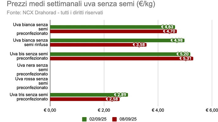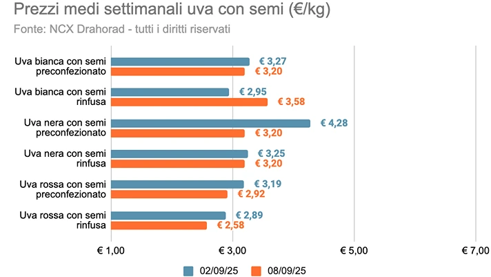 La referenza con il prezzo/chilo medio più elevato è stata l'uva bis senza semi (5,31€/kg), con una variazione del +2,1% rispetto alla settimana precedente.