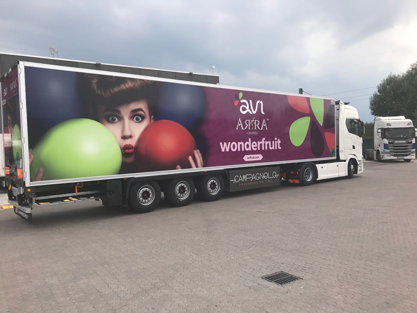 Sta circolando in Europa il primo camion che pubblicizza le uve ARRA™ wonderfruit. Il camion è della ditta Campagnolo Trasporti