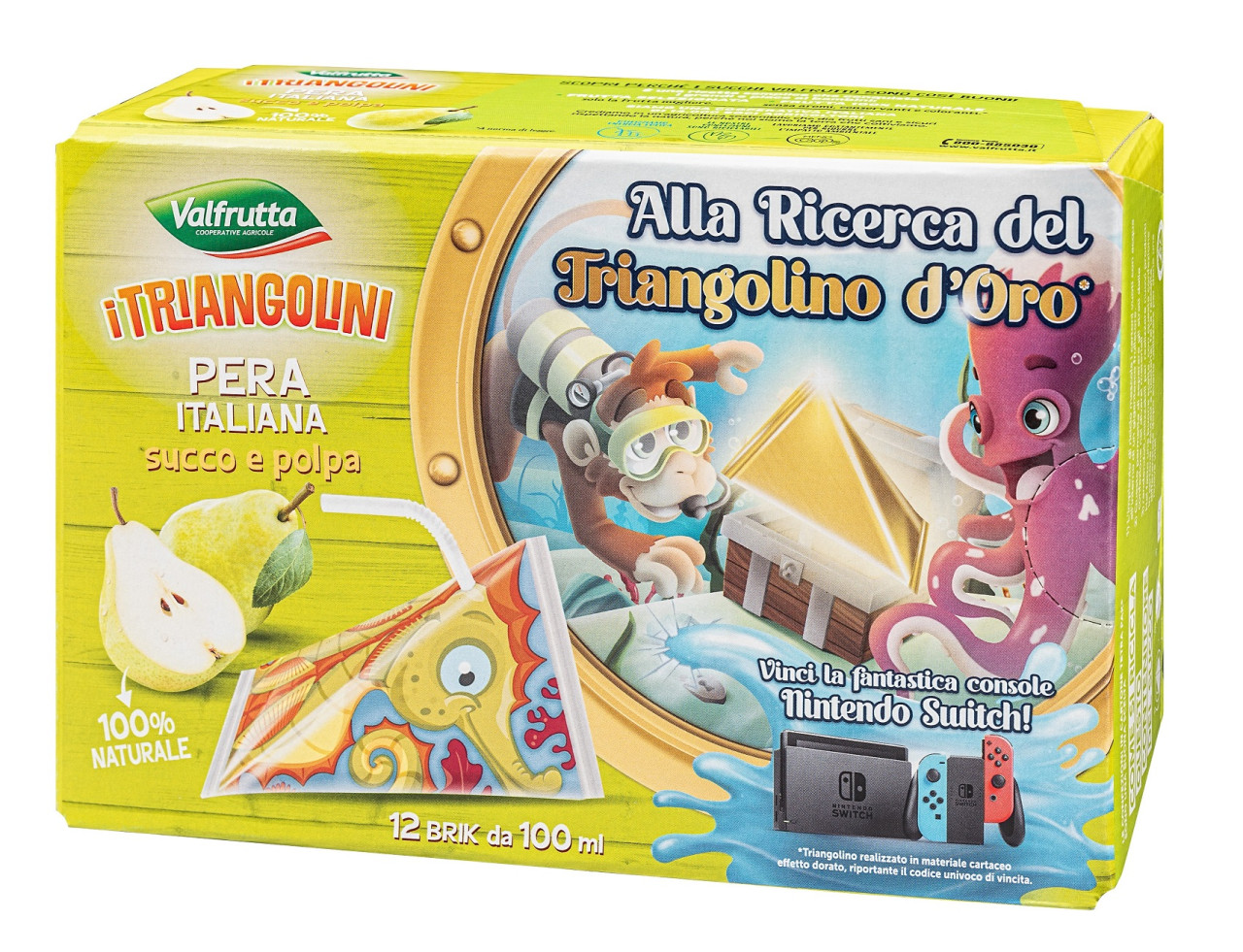 Nella nuova collezione dei succhi per bambini (contraddistinti dall'originale brik da 100 ml a forma triangolare, ai gusti di pesca, pera e albicocca) i piccoli animali esploratori sono impegnati nella ricerca del triangolino d'oro nascosto nel relitto di un antico galeone in fondo al mare. I consumatori che troveranno il triangolino d'oro all'interno della confezione si aggiudicheranno una Nintendo Switch.