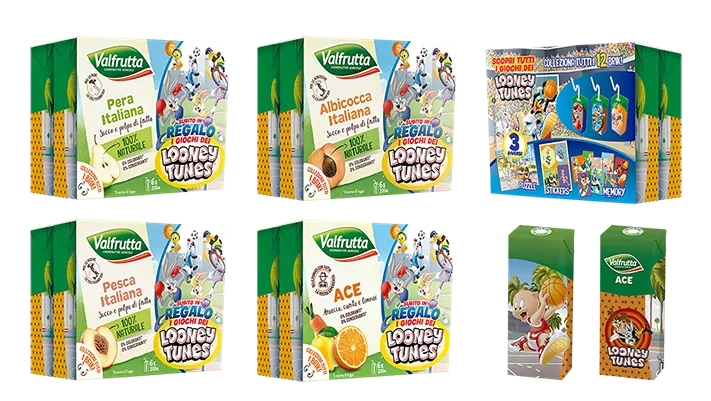Tutti i prodotti sono caratterizzati da packaging personalizzati con le rappresentazioni di 12 personaggi dei Looney Tunes, protagonisti di una limited edition ispirata allo sport e al movimento. La meccanica promozionale prevede inoltre la presenza di tre tipologie di gadget all’interno delle confezioni di succhi in brik, pensati per trasformare ogni acquisto in un momento di gioco e scoperta, anch’essi ispirati ai Looney Tunes impegnati in molteplici discipline sportive: i mini puzzle a dodici pezzi; le memory card per stimolare attenzione e concentrazione; gli adesivi collezionabili con i personaggi più iconici.