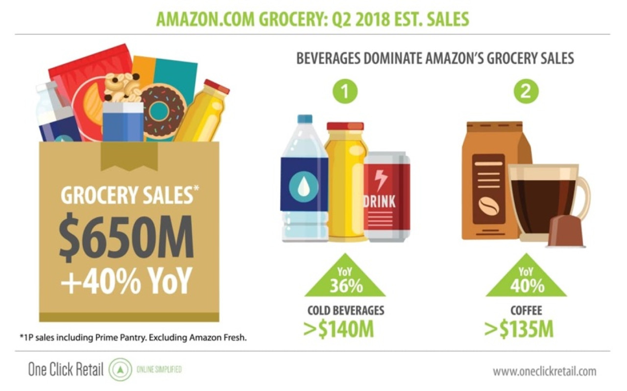 Gli ultimi dati stimati da One Click Retail parlano di +40% nel secondo quarto del 2018 (includendo Prime Pantry, ma escludendo Amazon Fresh): vendite stimate, anche in questo lasso di tempo a 650 milioni di dollari e un andamento che vede un po' tutti i generi alimentari attrarre sempre più clienti. Jacob Porter, direttore del marketing di One Click Retail e autore del rapporto giudica ormai innegabile il ruolo centrale di Amazon nel mondo alimentare nel prossimo futuro, considerando la sua capacità di consegna il giorno stesso o quello successivo all'ordine e la possibilità di offrire ai clienti molteplici soluzioni con Whole Foods, Prime Pantry, Amazon Fresh, Solimo.
