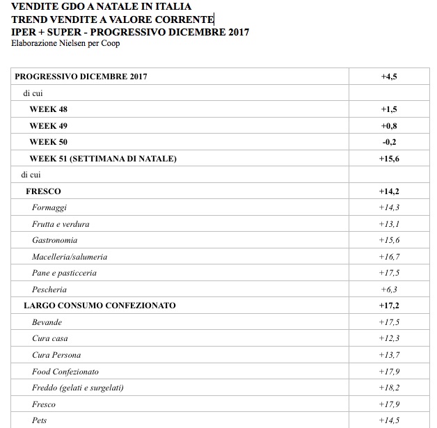 Le festività appena terminate consegnano performance più che positive al mondo ortofrutticolo. È quanto emerge dalle analisi elaborate da Nielsen per Coop (vendite a valore corrente Iper+Super, progressivo dicembre 2017).