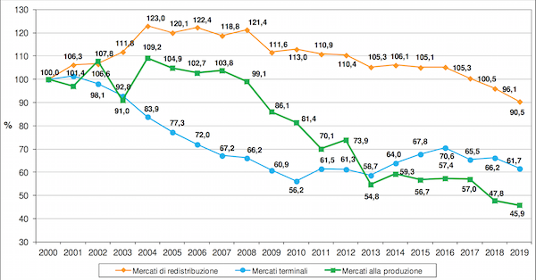 Anche in termini di valore, si registra una flessione rispetto al 2018: circa 766 milioni di euro, pari a una contrazione del 8,9%. A determinare questo risultato, non solo la diminuzione delle merci, ma anche il prezzo medio dei prodotti scambiati sui mercati, sceso a 0,95 euro/kg (-3% rispetto al 2018).
