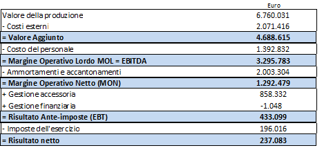 I principali dati patrimoniali indicano un attivo di 42.979.871 euro, passività per 7.553.095 euro e un patrimonio netto di 35.426.777 euro.