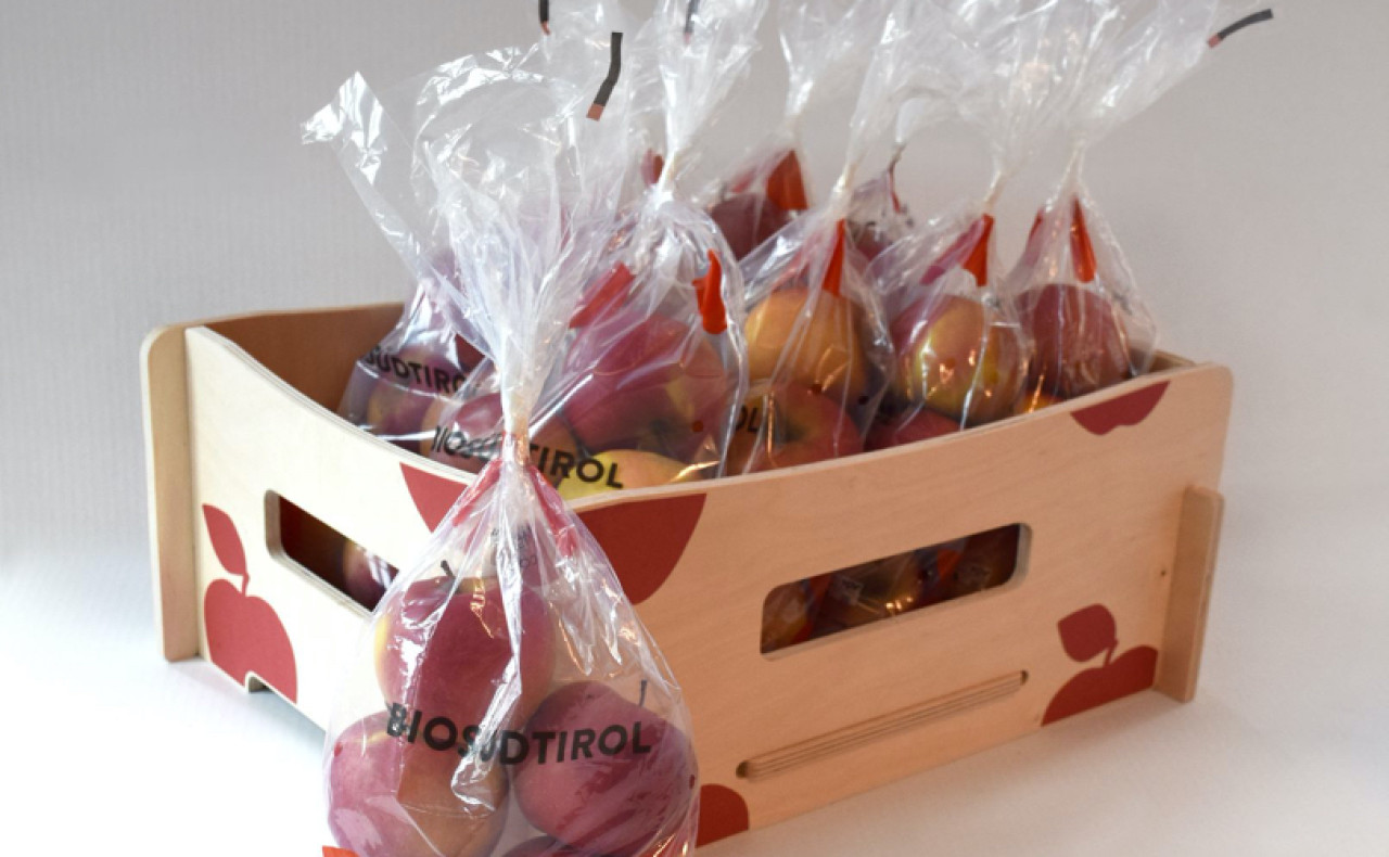 I sacchetti trasparenti al 100% compostabili, certificati e totalmente ogm free, sono realizzati in canna di zucchero, olio di cardo e olio di semi di girasole. “Incontrano pertanto tutti i requisiti europei per essere compostati a casa e si decompongono entro 180 giorni” afferma l'azienda. I sacchetti biodegradabili, che possono contenere da 750 g a un chilo di mele, saranno introdotti inizialmente sul mercato da Biosüdtirol, la cooperativa bio del VOG all’avanguardia nella ricerca di soluzioni ecologiche. Ad essi si affiancano gli imballaggi in “carta erba” per le mele. “Si tratta di un materiale composto fino al 50% da erba essiccata e per la parte restante da carta da macero o da fibre fresche di legno. Per ogni tonnellata di “carta erba” si risparmiano circa 6.000 litri d’acqua e, al contempo, il consumo di energia elettrica e le emissioni di anidride carbonica risultano nettamente inferiori rispetto al trattamento chimico del legno”.