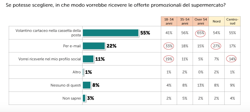 Entrando nel merito dei risultati, a sorprendere è la propensione dei giovani verso questo strumento. Il 41% del campione ricadente nella fascia tra 18 e 34 anni, infatti, lo indicata come l'opzione più idonea per conoscere le offerte dei supermercati.