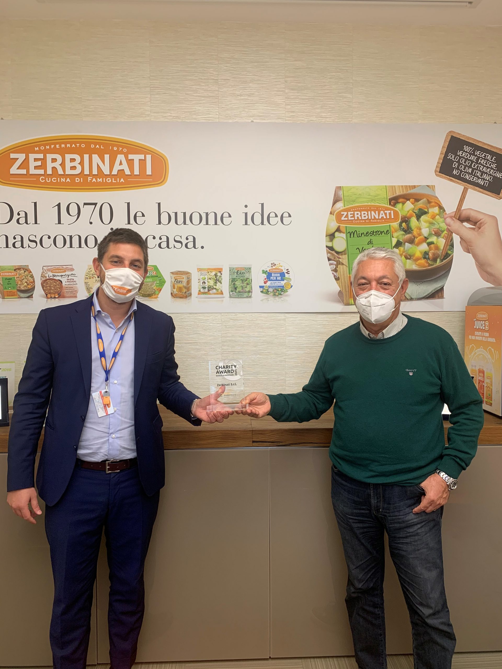 Simone Zerbinati, direttore generale della Zerbinati, e Franco Ballocco di Banco Alimentare Piemonte alla consegna del Charity Award 2020