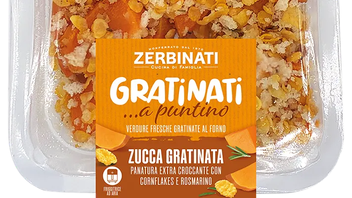 Con i Gratinati…a puntino, Zerbinati dona carattere ad ogni referenza grazie ad una panatura extra croccante che rende unico ogni vegetale: zucca, zucchine e pomodori sono coperti da una sfiziosa gratinatura a base di pangrattato, cornflakes ed erbe aromatiche.