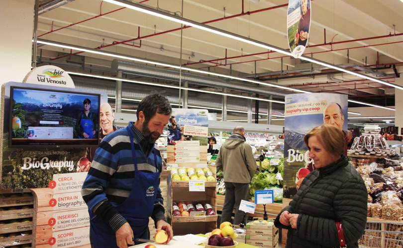 Il progetto BioGraphy di VI.P – Bio Val Venosta entra nel vivo. A Terni, in un supermercato Coop, Christian Pohl, contadino venostano, protagonista