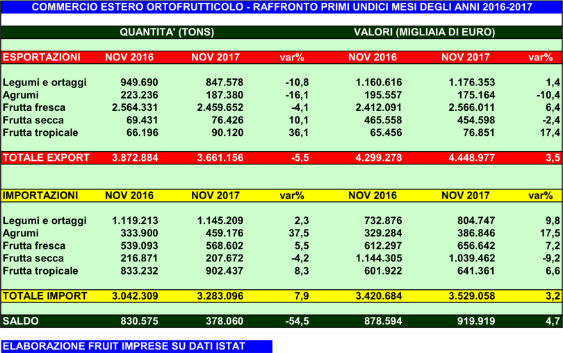 Nei primi sette mesi del 2017, il comparto della frutta secca ed essiccata conferma la tendenza, in atto già da diversi mesi, a crescere in volumi ma a diminuire in fatturato, rispetto all’analogo periodo del 2016. Questo, in sintesi, è quanto si evince dai dati diffusi da Fruitimprese, su elaborazione di dati Istat. In particolare, […]