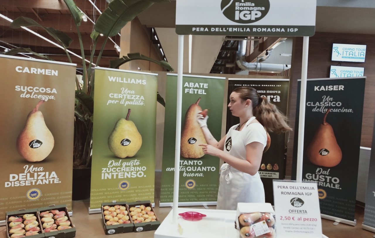 Promozione con degustazione della pera Emilia Romagna Igp e vendita dei prodotti del mercato all'ingrosso bolognese