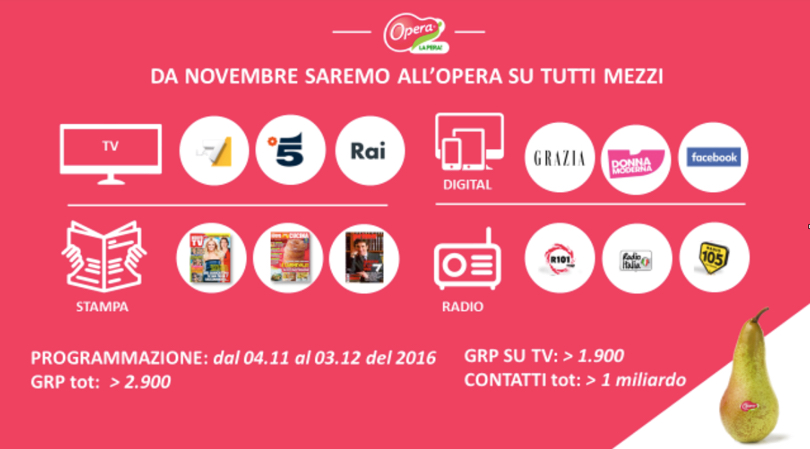 A poco più di un anno dalla sua nascita, il Consorzio Opera decide di investire in modo massiccio con una campagna pubblicitaria rivolta al grande pubblico. Coinvolte TV, Radio, stampa, web e social. Granata. “Ridare alla pera il valore che si merita”