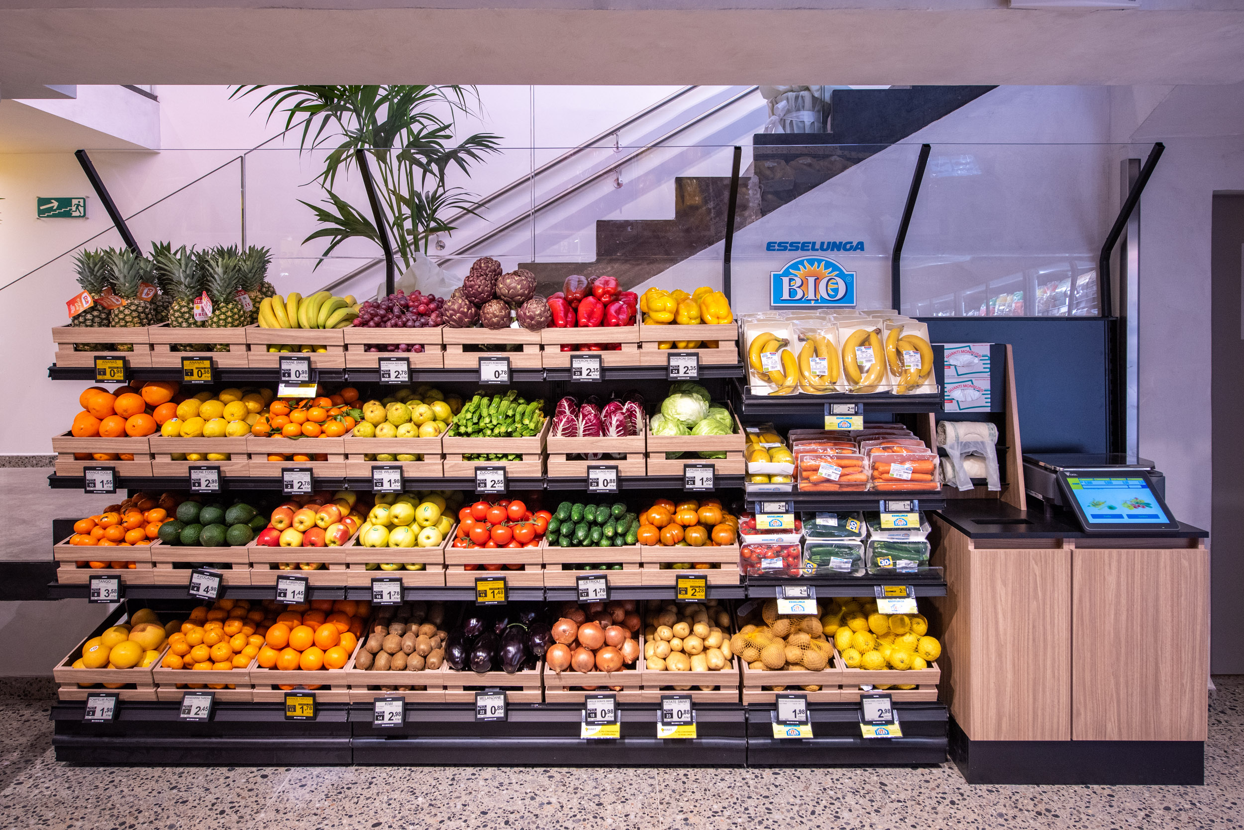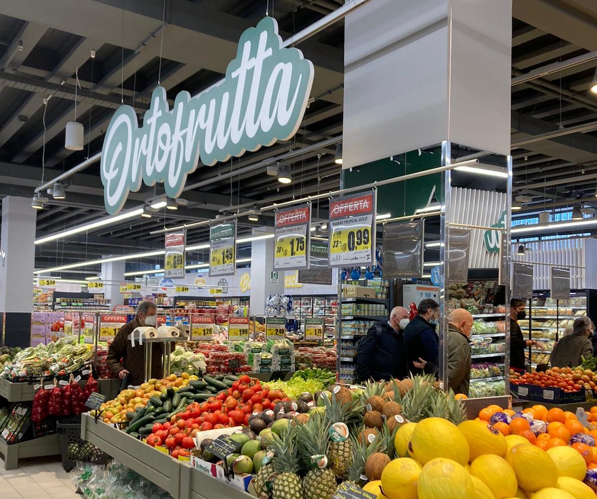 Isole ortofrutta centrali, reparto nel quale rivivono colori tipici di alcuni importanti localismi. E circuito di segnaletica digitale