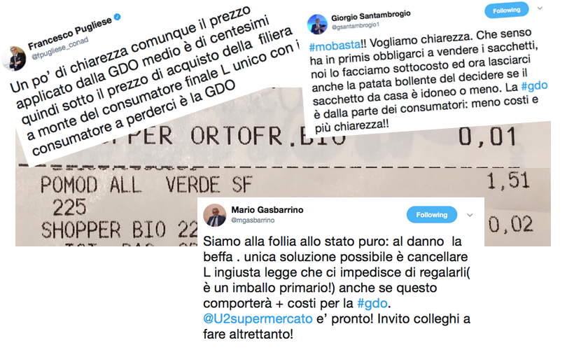 Le reazioni della grande distribuzione? Molti manager del comparto rispondono alle accuse e lanciano proposte via social, twitter in particolare. Tra le soluzioni cambiare la legge e rendere nuovamente gratuiti i sacchetti per frutta e verdura