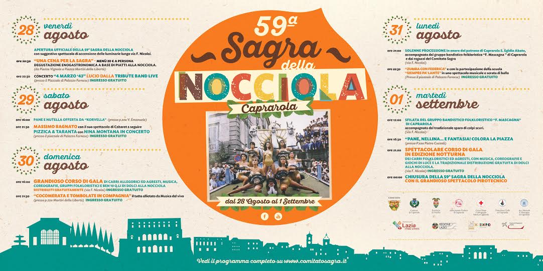 Si chiude oggi a Capararola (VT) la cinque giorni della Sagra della Nocciola, giunta quest’anno alla sua 59° edizione. Il programma prenderà il via fin dalle 12, con la sfilata per le vie del paese del gruppo bandistico folkloristico “Mascagna” di Caprarola, accompagnata dal tradizionale sparo di “colpi scuri”, ovvero nocciole. Alle 16,30, arriverà il […]
