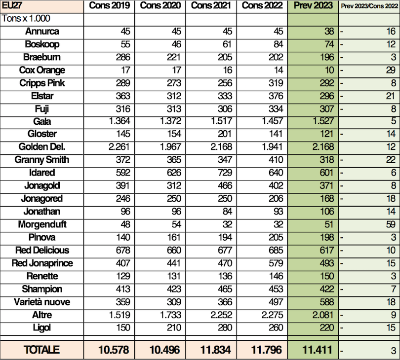 Le stime di produzione per il 2023 prevedono un raccolto di mele in Europa pari a 11,411 milioni di tonnellate, il 3% in meno rispetto allo scorso anno. Sul fronte pere, invece, quello europeo sarà uno dei raccolti più scarsi degli ultimi anni (-12,9% sul 2022).